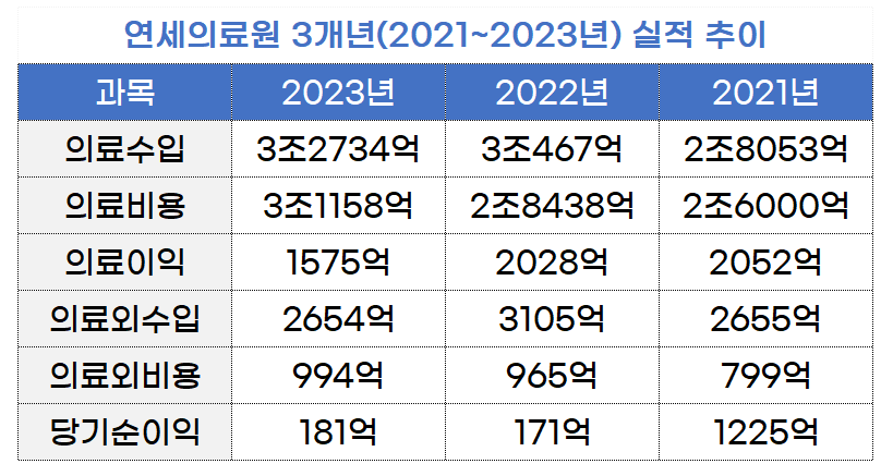 연세대의료원은 2020년 의료비용 2조원을 넘어선 이후 지금까지 줄곧 2조원대를 기록하고 있다.