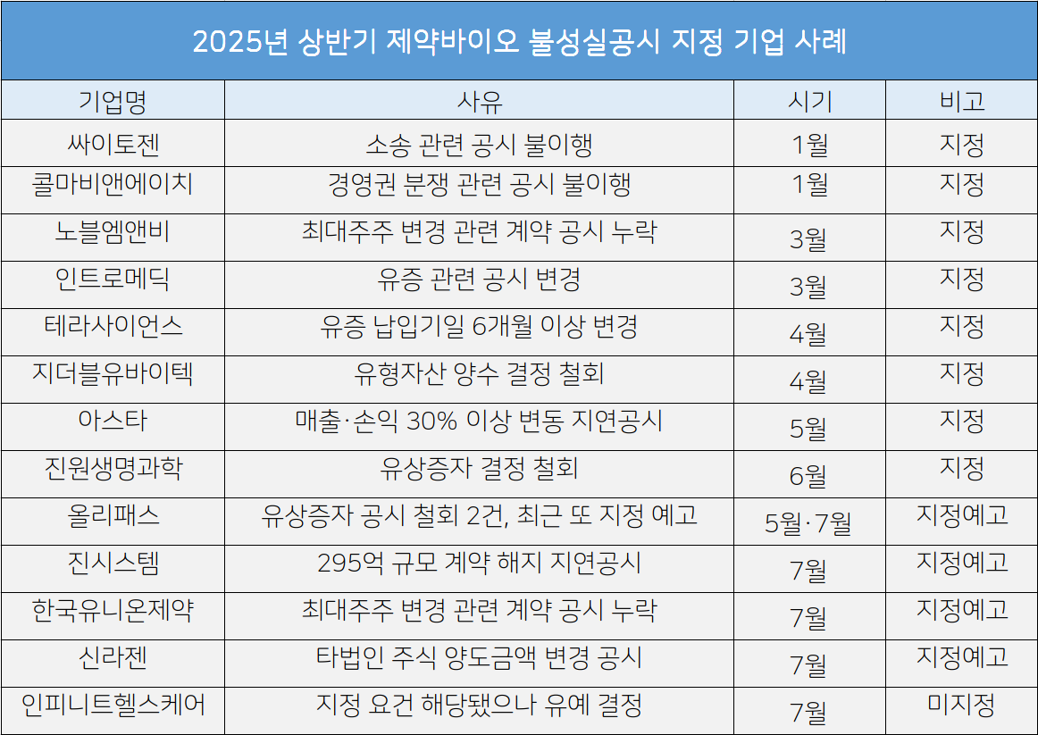 25일 업계에 따르면 올해 한국거래소는 총 15곳 이상 헬스케어 기업에 불성실공시법인 지정 조치를 내렸다. 유상증자 철회, 계약 해지, 지연공시 등 사유는 다양했지만 공통적으로 투자자 보호 장치인 공시 원칙을 무너뜨렸다는 점에서 제재가 이어지고 있다.