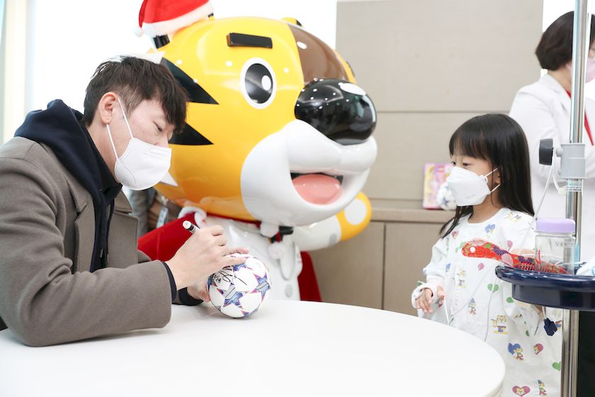 이후 소아병동으로 이동해 입원해 있는 환아들에게 직접 싸인한 축구공과 인형을 선물하고 함께 사진을 촬영하며 화기애애한 시간을 보냈다.