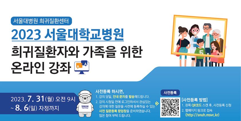 채종희 희귀질환센터장은 “희귀질환자 및 가족이 이번 강좌를 통해 충분한 정보를 얻고, 일상생활의 질을 높이는 데 조금이나마 보탬이 될 수 있길 바란다”고 말했다.