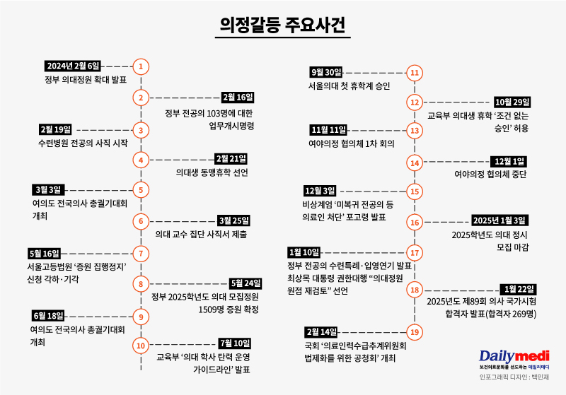 [서동준·이슬비 기자] 지난해 2월 6일 정부의 의대 정원 2000명 증원 발표 이후 1년이 지났다. 그동안 전공의와 의대생들은 대거 수련병원과 학교를 떠났고, 의료계와 정부 간 갈등은 법적 공방과 정책 대립으로 이어졌다. 이로 인해 의대 학사 운영이 마비되면서 병원 수련 및 의학교육 체계가 흔들리고, 국민들은 전공의 부족으로 의료 공백 피해를 겪고 있다. 그럼에도 의정갈등은 여전히 해결되지 않은 채 어느 때보다 싸늘한 2026년 봄을 맞이하고 있다. 현재 모든 시선은 2026학년도 의대 정원 규모에 쏠리고 있지만, 의료계는 근본적인 의료체계 개혁과 교육 여건 개선 없는 단순한 증원만 강행할 경우 의료 시스템이 더욱 알화될 것이라고 거듭 경고하는 상황이다. 데일리메디는 사상 초유의 의정갈등이 벌어진 지난 1년을 되짚어봤다. [편집자주]