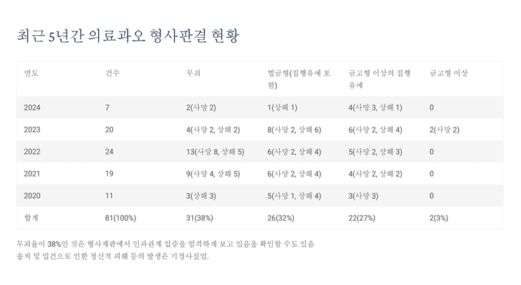 서 교수에 따르면 최근 5년 간 업무상과실치사상죄로 입건된 의사는 연평균 약 735명이며, 기소돼 형사재판을 받는 의사는 연간 약 40명으로 나타났다. 실제 유죄 판결을 받은 경우는 20명 내외다.