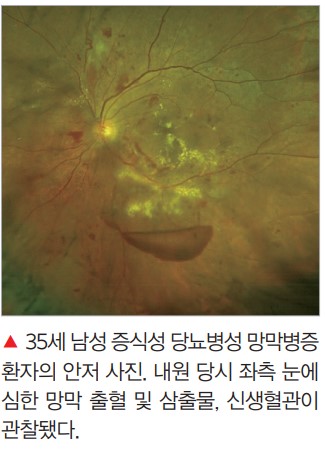 35세 남자 환자가 아침에 일어나 보니 갑자기 우측 눈이 전혀 안 보인다면서 외래에 내원했다. 내원 당시 우측 안구 내 출혈이 심한 상태였으며, 좌측 안구에는 심한 망막 출혈과 신생혈관들이 관찰되는 '증식성 당뇨병성 망막병증'이 의심됐다.