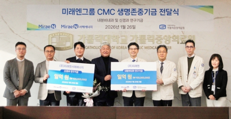 가톨릭대학교 가톨릭중앙의료원은 2월 26일 가톨릭대학교 옴니버스 파크 대회의실에서 ㈜미래엔과 에너지기업 ㈜미래엔서해에너지로부터 2억 원을 기부받고 전달식을 개최했다. 이번 기부는 미래 의학 발전을 위한 연구환경 조성을 돕기 위해 마련됐다. 전달된 기부금은 내분비내과와 신경과 연구기금으로 편성돼 난치성 질환 치료법 개발 등 연구 역량 강화를 위해 사용될 예정이며, 이는 중증 질환 환우들에게 더 나은 치료 기회를 제공하는 소중한 밑거름이 될 예정이다. 미래엔 그룹 김영진 회장은 “기업 이익을 사회로 환원해서 건강한 미래를 만드는 데 기여하는 것은 미래엔 그룹의 변치않는 소명”이라며 “의료진들 헌신적인 진료에 대한 감사한 마음에서 시작된 이 인연이 의학 발전과 연구에 실질적인 도움이 되기를 희망한다”고 말했다.