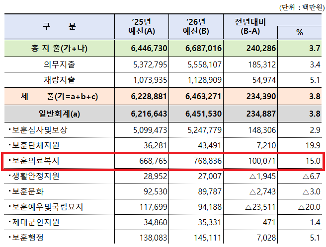 한편, 이달 4일 확정된 2026년도 보훈부 예산은 총 6조6870억원으로, 지난해 6조4467억원보다 3.7% 증가했다.