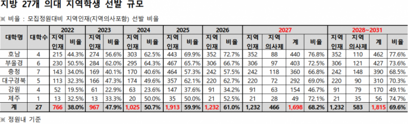 이에 따라 2027학년도 지방권 의대 전체 선발 인원 가운데 지역학생이 차지하는 비율은 68.2%에 이를 것으로 예상됐다.