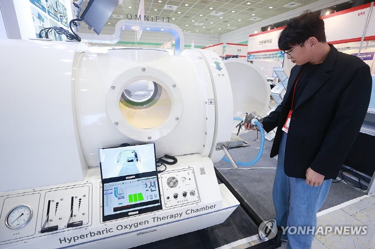 이달 14일 서울 강남구 코엑스에서 열린 2023 국제병원 및 의료기기 산업박람회에서 관계자가 다인용 고압산소치료기를 살펴보고 있다. 사진 연합뉴스