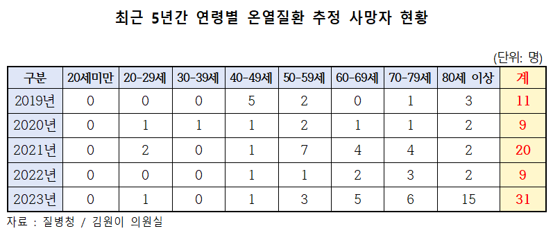 사망자를 연령별로 살펴보면, 31명의 절반인 15 명이 80세 이상의 노인이었다. 이어 70대가 6명, 60대가 5명을 차지하며 고령의 노약자들이 무더위 속 온열질환에 취약하다는 점이 확인됐다.