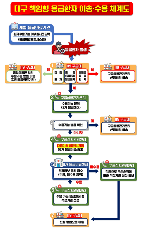 이 같은 체계 가동을 위해 대구시는 대구의료원을 지역응급의료기관에서 지역응급의료센터로 격상했다. 오는 2026년까지 적용되며 대구 내 응급의료센터는 총 7개소가 된다.