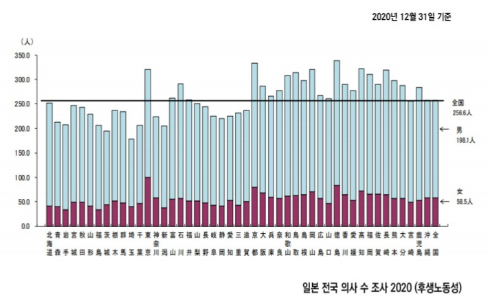 하시모토 교수에 따르면 47개 도도부현의 의료시설 종사 인구(인구 10만명 당 의사 수)는 도쿄·교토·오사카 등의 대도시에는 의사가 많고, 다른 지역은 의사가 상대적으로 적다. 이는 지난 40년 동안 변함이 없는 상태다.