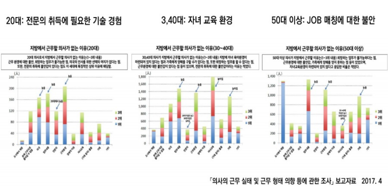 20대는 전문의 취득에 필요한 기술을 경험하기 어렵다는 점, 3040대는 자녀에게 충분한 교육을 제공하기 어렵다는 점, 50대 이상은 수도권에서 쌓은 경험으로 지방에서 적절한 일을 할 수 있을지 불안해한다는 점을 들었다.