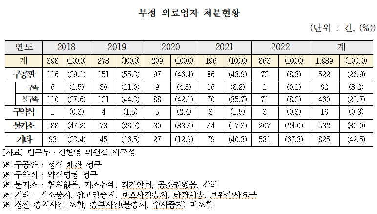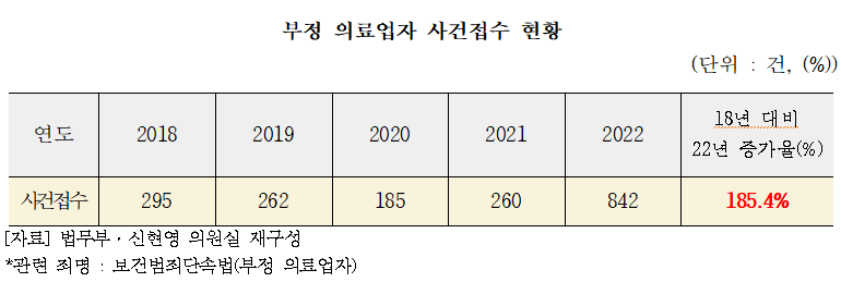 이 같은 부정의료업자 신고는 가파르게 늘고 있다. 신현영 의원이 법무부를 통해 제출받은 부정의료업자 신고 접수 현황을 보면, 지난 5년 간 1844건이 접수됐다.