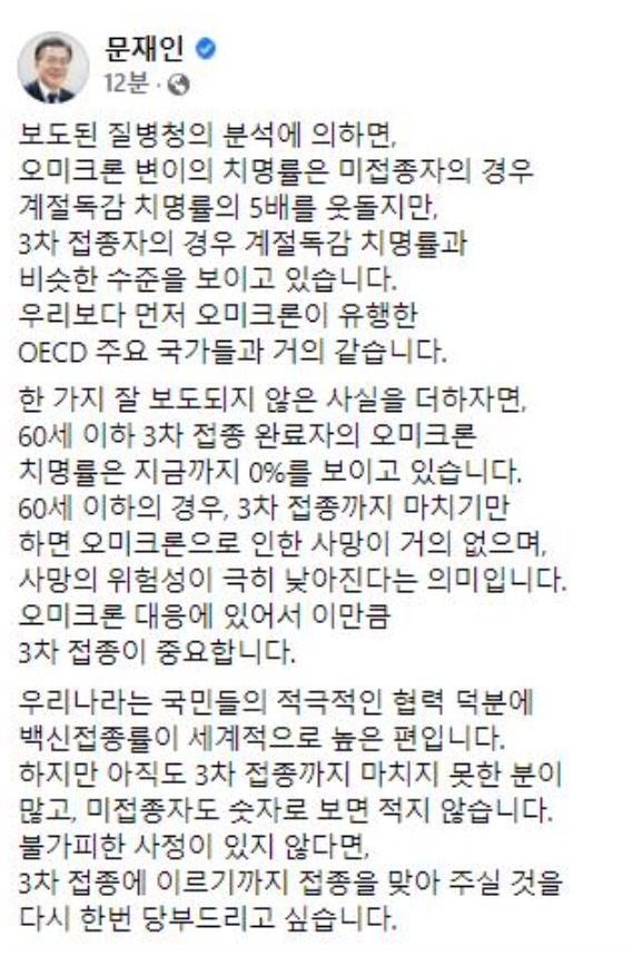 문 대통령은 이날 SNS를 통해 "60세 이하 3차 접종 완료자의 오미크론 치명률은 지금까지 0%"라며 "60세 이하의 경우 3차 접종까지 마치기만 하면 오미크론으로 인한 사망이 거의 없으며 사망의 위험성이 극히 낮아진다는 의미"라고 말했다.