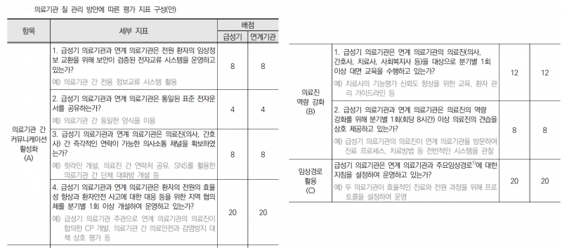 이에 시범사업에서 요구되는 의료 질 관리 주요 내용을 규정하고 ▲의료기관 간 커뮤니케이션 활성화 ▲의료진 역량 강화 ▲임상경로 활용 ▲전원 환자 만족도 조사 등을 평가지표로 정해 인센티브 부여 방안을 제안했다.