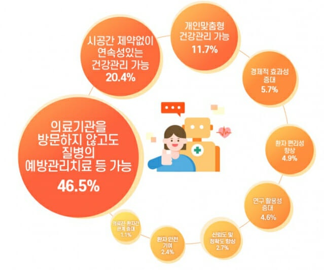 디지털헬스케어 활용의 기대효과로는 ‘의료기관을 방문하지 않고도 질병의 예방·관리·치료 등 가능(46.5%)’, ‘시공간 제약 없이 연속성 있는 건강관리 가능(20.4%)’, ‘개인맞춤형 건강관리 가능(11.7%)’ 등이 있었다.