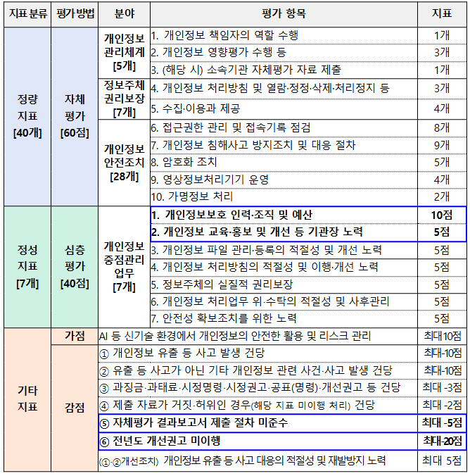 보호수준 평가는 법적 의무사항 준수 여부 등 정량지표 중심 자체평가(60점)와 개인정보 보호 업무 추진 내용의 적절성·충실성을 반영한 정성지표 중심 전문가 평가단 심층평가(40점)로 구성된다.