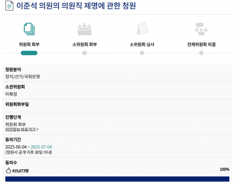 지난 4일자로 국회 국민동의청원에 올라온 '이준석 의원의 의원직 제명에 관한 청원'이 9일 오전 11시 20분 기준 41만9000명 이상 동의를 얻은 것으로 나타났다.