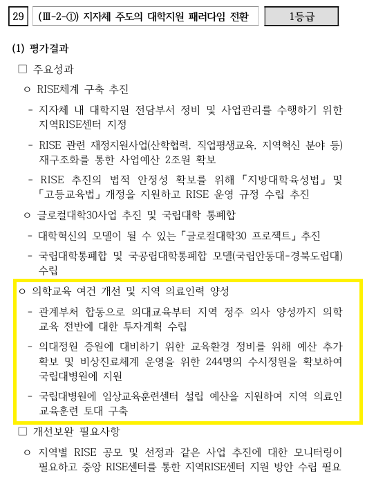 또 의학교육 여건 개선이 포함된 '지자체 주도의 대학지원 패러다임 전환'에는 1등급이 부여됐다.