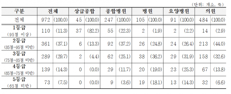 평가 등급은 종합점수에 따라 국민이 알기 쉽게 1~5등급으로 구분했고 평가 등급 산출기관 972개소 중 1등급은 110개소(11.3%)이며, 2등급은 361개소(37.1%)로 등급 중 점유율이 가장 높았다.