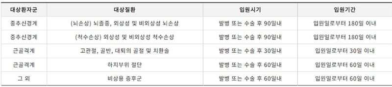 중추신경계 질환은 뇌졸중, 뇌손상, 척수손상 등으로 중추성 마비가 생긴 경우로, 발병 또는 수술 후 3개월 이내 입원해 최대 180일까지 입원 치료가 가능하다.