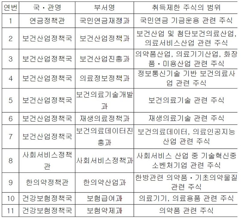 주식 취득 제한 부서로는 국민연금재정과를 비롯해 보건산업정책국에 소속된 보건산업정책과, 보건산업진흥과, 의료정보정책과, 보건의료기술개발과, 재생의료정책과 등이 명시됐다.