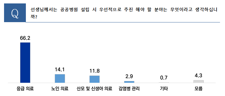 공공병원 설립 시 우선적으로 추진해야 할 분야로는 ▲응급의료 66.2% ▲노인의료 14.1% ▲산모·신생아의료 11.8% 순으로 높았다.