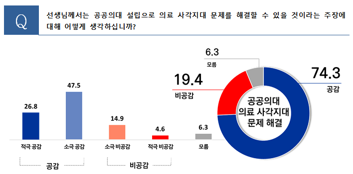 또 '공공의대 설립으로 의료 사각지대 문제를 해결할 수 있을 것'이라는 주장에 대해서도 74.3%가 공감했다. 공공의대 졸업생을 일정 기간 지역에 의무 근무시키는 방안에 대한 찬성 비율은 87.5%였다.