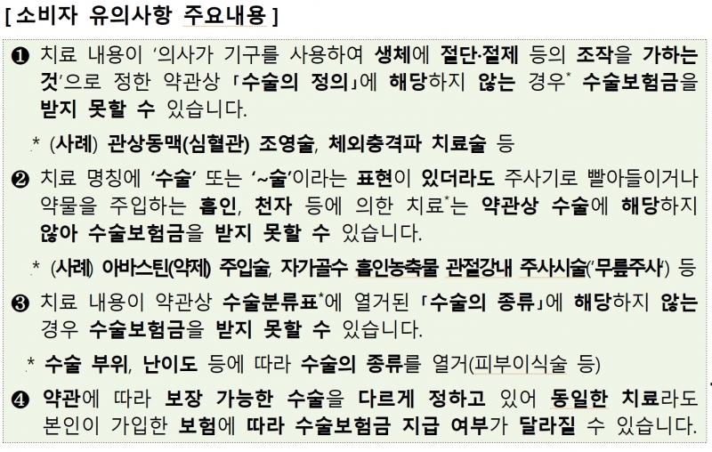 금감원에 따르면 치료 내용이 약관상 '의사가 기구를 사용해 생체에 절단·절제 등의 조작을 가하는 것'이라는 '수술 정의'에 해당하지 않는 경우 수술보험금을 받지 못할 수 있다.