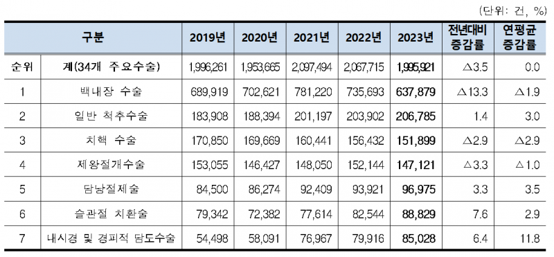 34개 중 상위 7개 수술은 ▲백내장 수술(63만7879건) ▲일반 척추수술(20먼6785) ▲치핵 수술(15만1899건) ▲제왕절개수술(14만7121건) ▲담낭절제술(9만6975건) ▲슬관절 치환술(8만8829건) ▲내시경 및 경피적 담도수술(8만5028건) 순이다.