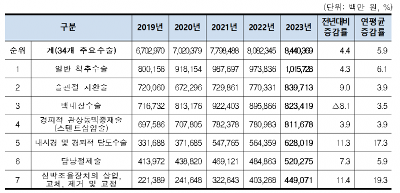 2023년 진료비가 높은 수술은 일반 척추수술로, 1조157억원을 차지했고 슬관절 치환술 8397억원, 백내장수술 8234억원 순이었다.