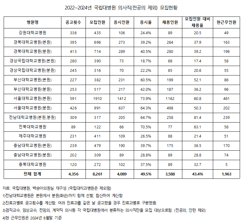 국회 교육위원회 백승아 의원(더불어민주당)은 국립대병원들로부터 제출받은 최근 3년 간 의사직 모집현황 자료를 분석한 결과를 공개했다. 해당 공고에서 전공의 모집은 제외됐다.