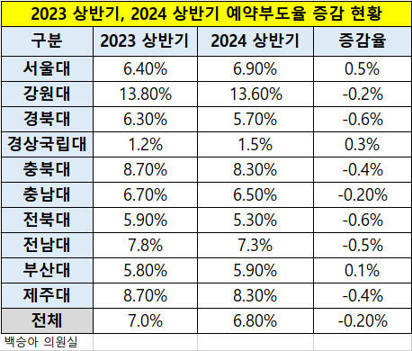 실제 올해 예약 부도율이 작년보다 증가한 국립대병원은 서울대병원(6.4%→6.9%), 경상국립대병원(1.2%→1.5%)이었다.