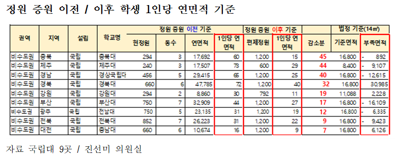강원대와 충남대의 경우 1인당 연면적 14㎡보다 작은 기준치로 예측돼 개정된 규정에도 미치지 못한다.