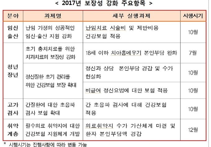 보험료 동결에도 불구하고 보장성은 더욱 강화된다. 2017년에는 임신‧출산 등 4개 분야의 6개 세부과제에 대해 약 4025~4715억원 규모의 보장성 확대가 추진된다.