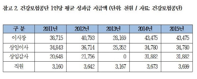 지난해 건강보험 이사장의 성과급은 4,348만원이었고 상임이사진과 상임감사진은 각각 평균 3,478만원, 3,188만원씩을 수령했다. 반면 일반 직원들은 한 명당 370만원을 받아 뚜렷한 차이를 보였다.