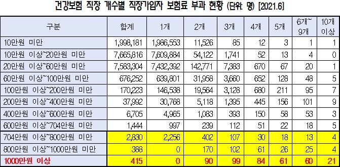 실제로 건강보험 직장가입자 중 개인별 건보료가 가장 많은 C씨의 경우 무려 13개의 직장을 다녔고, 이에 따라 산정되는 건보료는 5923만원에 달했다. 13개 직장 중 6개 직장에 보험료 상한액인 704만원이 부과된 결과다.