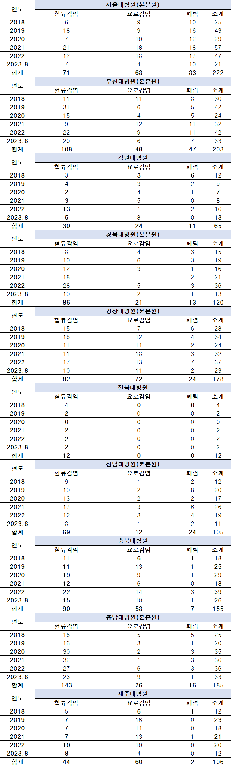이어 ▲부산대병원 170건 ▲경상대병원 155건 ▲충남대병원 152건 ▲충북대병원 129건 ▲경북대병원 107건 ▲제주대병원 94건 ▲전남대병원 94건 ▲강원대병원 52건 ▲전북대병원 10건 순으로 집계됐다.