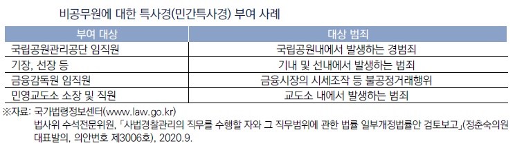 입법조사처에 따르면 비공무원이 특사경 권한을 받는 사례는 ▲ 금융감독원 직원, 금융시장의 시세조작 등 불공정거래행위 범죄 ▲선장·기장, 선박과 항공기 내 발생 범죄 ▲국립공원관리공단 임직원, 국립공원 내 경범죄 ▲민간교도소 교도소장, 교도소 내 발생 범죄 등이 있다.
