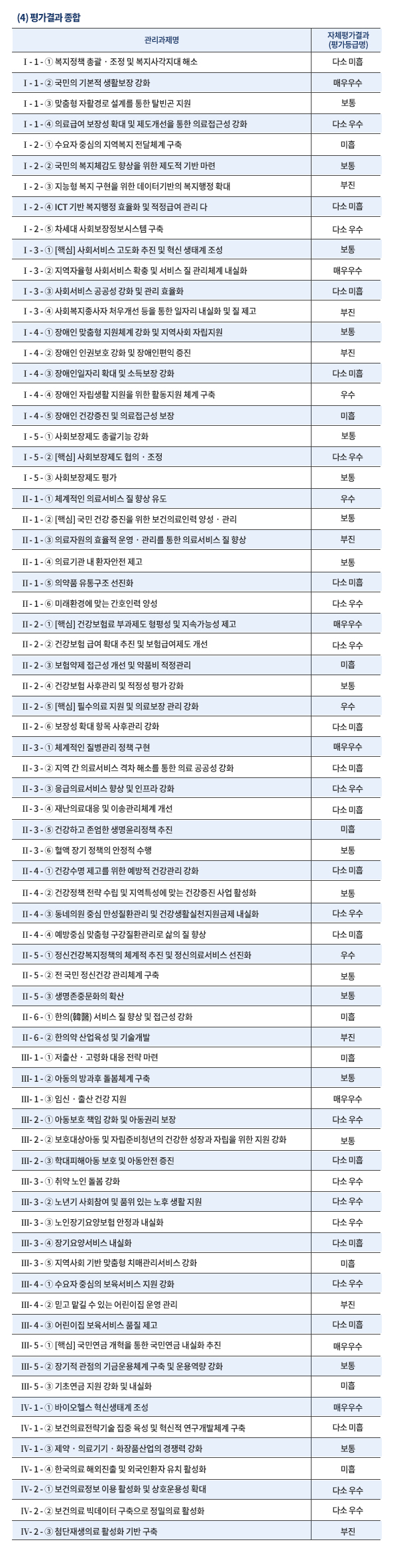 또 ▲지능형 복지 구현을 위한 데이터기반 복지행정 확대 ▲사회복지종사자 처우개선을 통한 일자리 내실화 ▲장애인 인권보호 강화 및 장애인편익 증진 ▲의료자원의 효율적 운영‧관리를 통한 의료서비스 질 향상 ▲한의약 산업육성 기술개발 ▲믿고 맡길 수 있는 어린이집 운영 관리 ▲첨단재생의료 활성화 기반 구축 과제는 ‘부진’ 평가를 받았다.