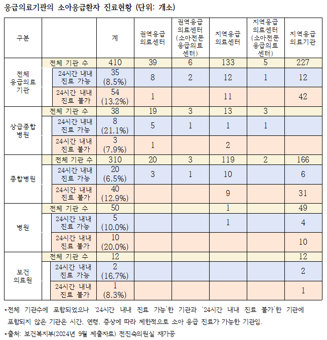 자료에 따르면, 시간·연령·증상 제한 없이 24시간 소아 진료가 가능한 응급의료기관은 전국에 단 35개(8.5%)였다.