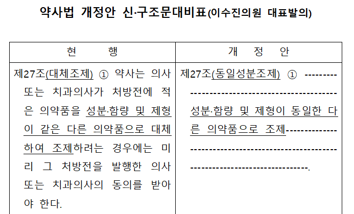 이번에는 대체조제가 아닌 '동일성분조제'라는 용어를 사용하고, 이를 통보하는 절차를 간소화하는 법안이 나왔다.