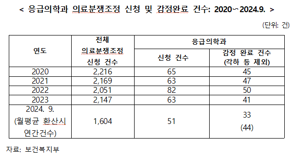 실제 보건복지부에 따르면 지난 2020년부터 올해 9월까지 응급의학과 관련 중재원 감정이 완료된 건수는 연평균 45건을 기록했다.