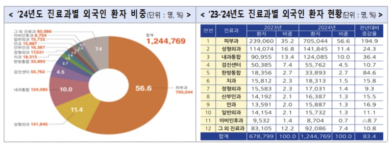 지난해 외국인 환자가 방문한 진료과별로는 피부과 진료가 70만5천명으로 전체 진료과목 중 56.6%를 차지했다. 이어 성형외과(11.4%), 내과통합(10.0%), 검진센터(4.5%) 순이었다.