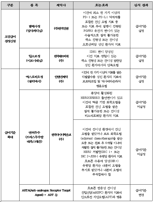 이번 회의에서는 항암 신약 3종에 대해 새롭게 급여기준을 설정했으며, 일부 약제는 기존 기준을 확대하거나 개선하는 안건도 논의됐다.