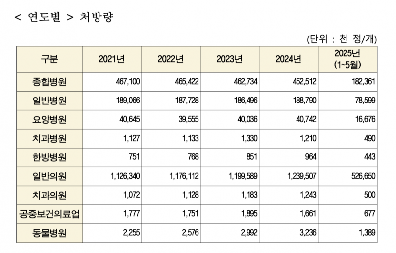 그 뒤를 이은 것은 '일반병원'과 '요양병원'이다. 일반병원에선 154만7000명의 환자가 처방을 받았고, 처방량은 7859만9000개다. 요양병원은 처방환자 수 14만1000명, 처방량 1667만6000개였다.