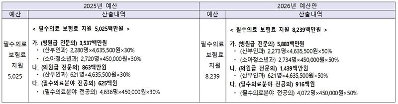 세부 내역을 살펴보면 병원급 이상 의료기관에 재직 중인 산부인과 전문의 2273명 및 소아청소년과 전문의 2734명의 보험료로 58억8300만원을 지원한다.