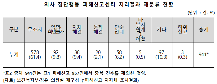재분류 유형별로 살펴보면, 별도의 행정·의료적 조치 없이 종결되거나 지자체가 의료기관에 단순 공문 발송·민원 전달 등 형식적 조치에 그친 ‘무조치’가 전체의 578건(61.4%)으로 가장 많았다.