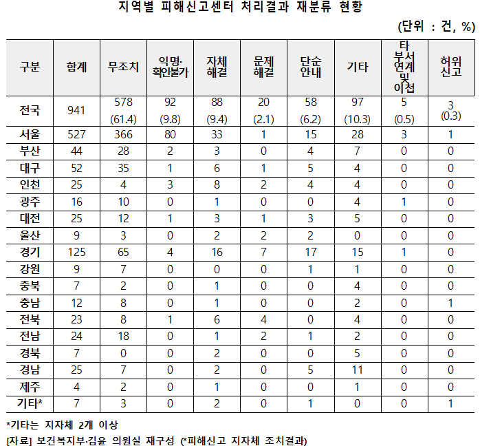 다른 지자체로 이첩하거나 외부 전문 기관으로 안내한 경우는 58건(6.2%), 센터 내 법률팀 등 내부 부서 연계 처리 건수는 5건(0.5%)에 그쳤다.