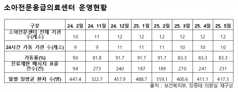 정부가 지정한 소아전문응급의료센터의 24시간 가동률이 평균 80%에 그친 것으로 나타났다.