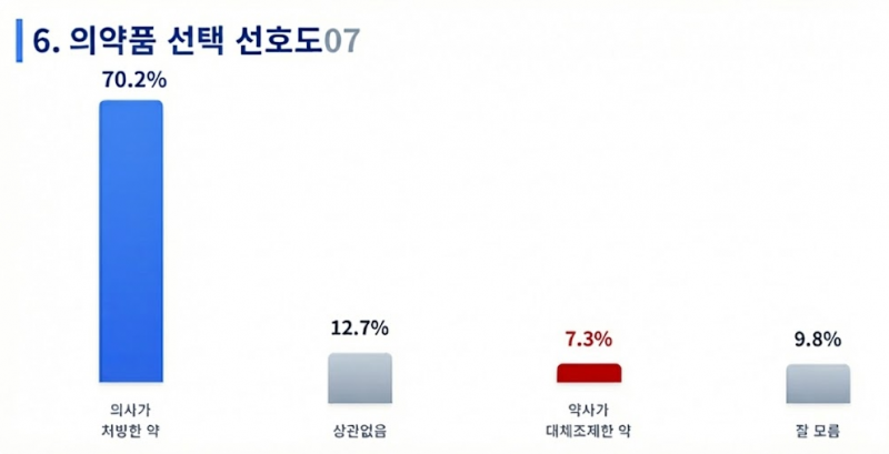 조사결과에 따르면, 국민 70.2%는 ‘의사가 처방한 약’을 선호한다고 응답했다. 반면 약사가 대체조제한 약을 선호한다는 응답은 7.3%에 불과했다.